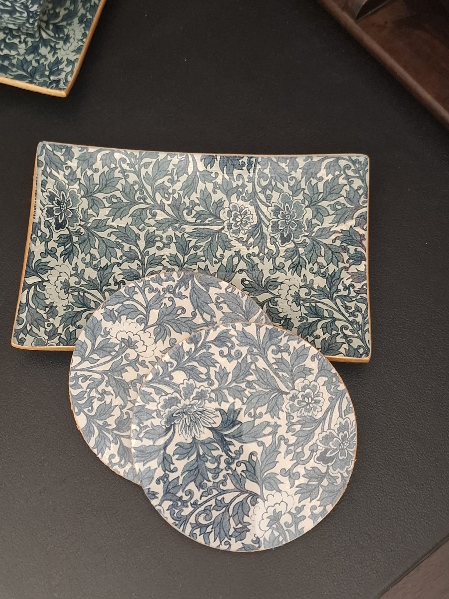 Elegante set de aperitivos artesanal decorado con la técnica de decoupage. El diseño Provenza Blue presenta un estampado floral en tonos azules y crema que evoca la Provenza francesa.