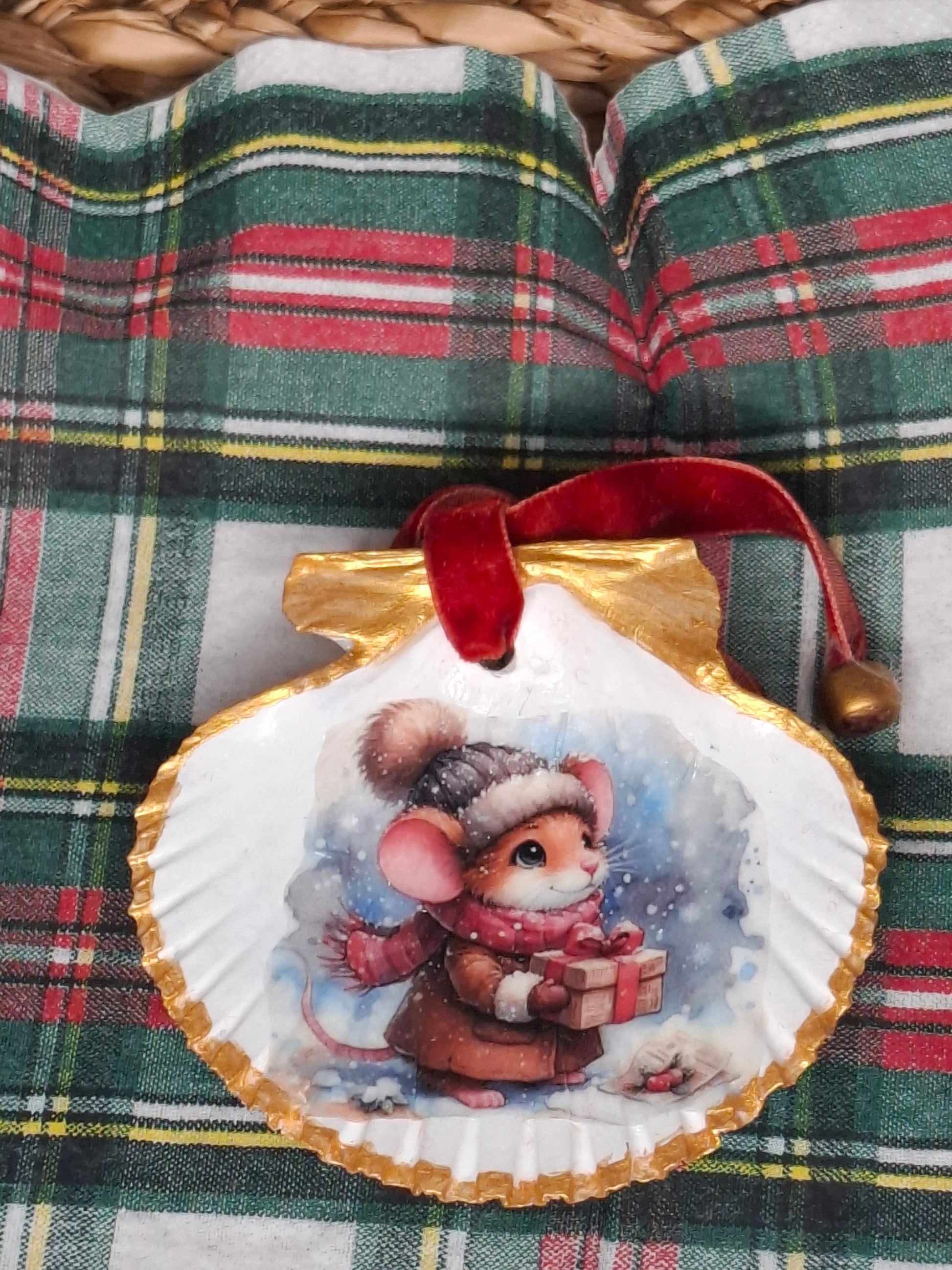 Esta preciosa vieira navideña decorada a mano presenta a Clementine, una dulce ratoncita con gorro rosa rodeada de regalos envueltos en un paisaje nevado mágico.